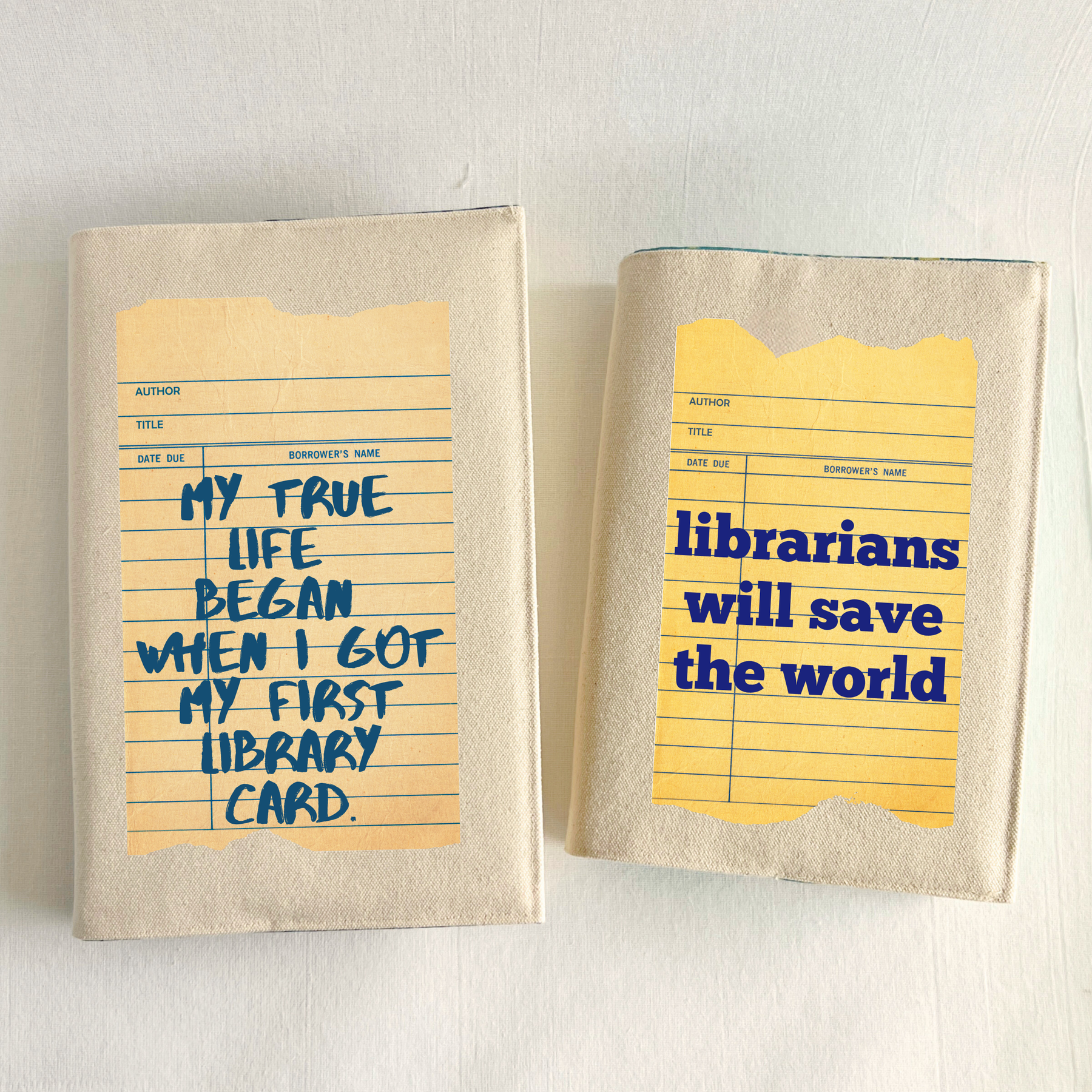 Canvas, reusable book covers in linen, both printed on vintage-style library check out card designs. One has the words,  'librarians will save the world,' and the other other says, 'My true life began when I got my first library card.'