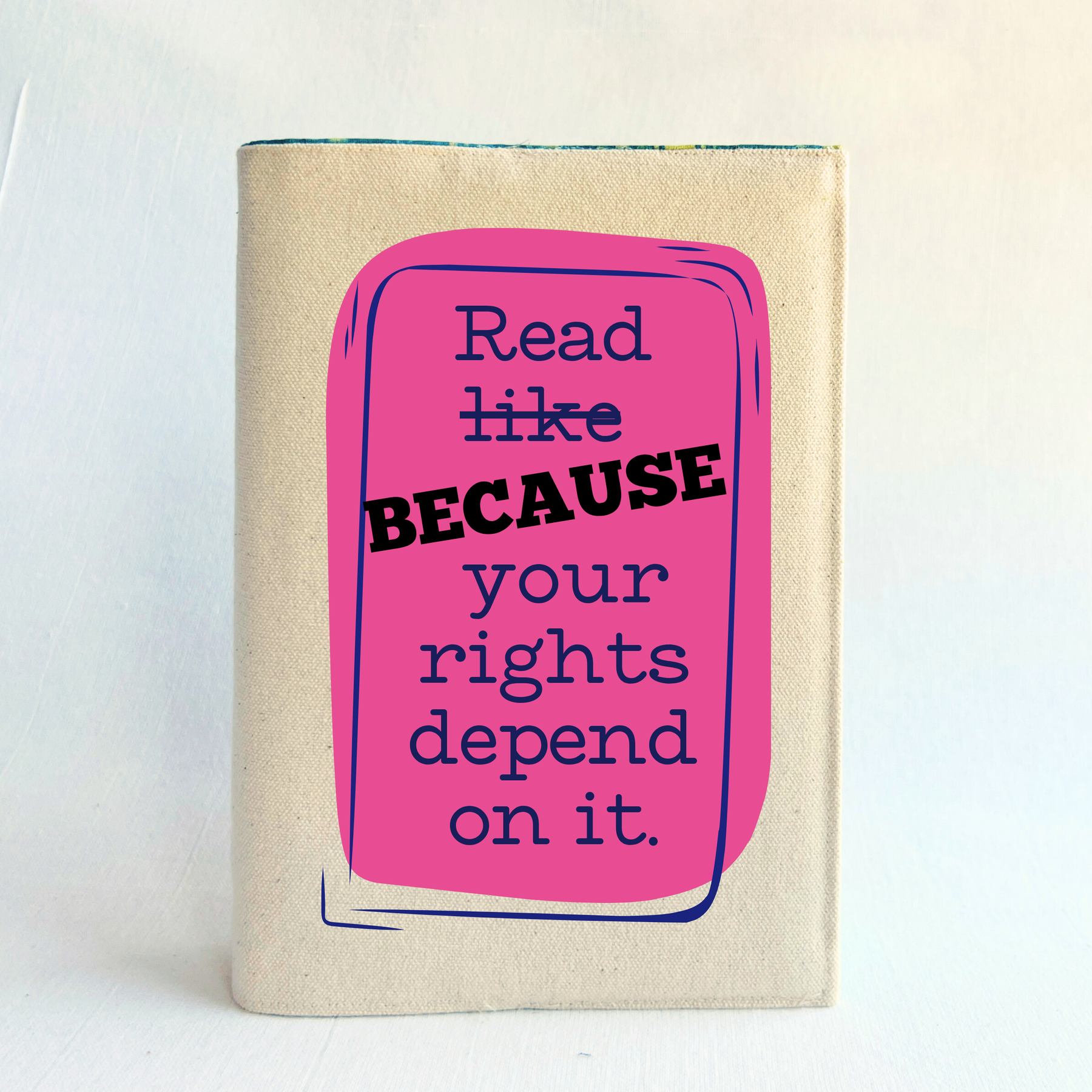 Canvas, reusable book cover in linen, with the words,  'Read like (because) your rights depend on it' in navy lettering on a pink box design.