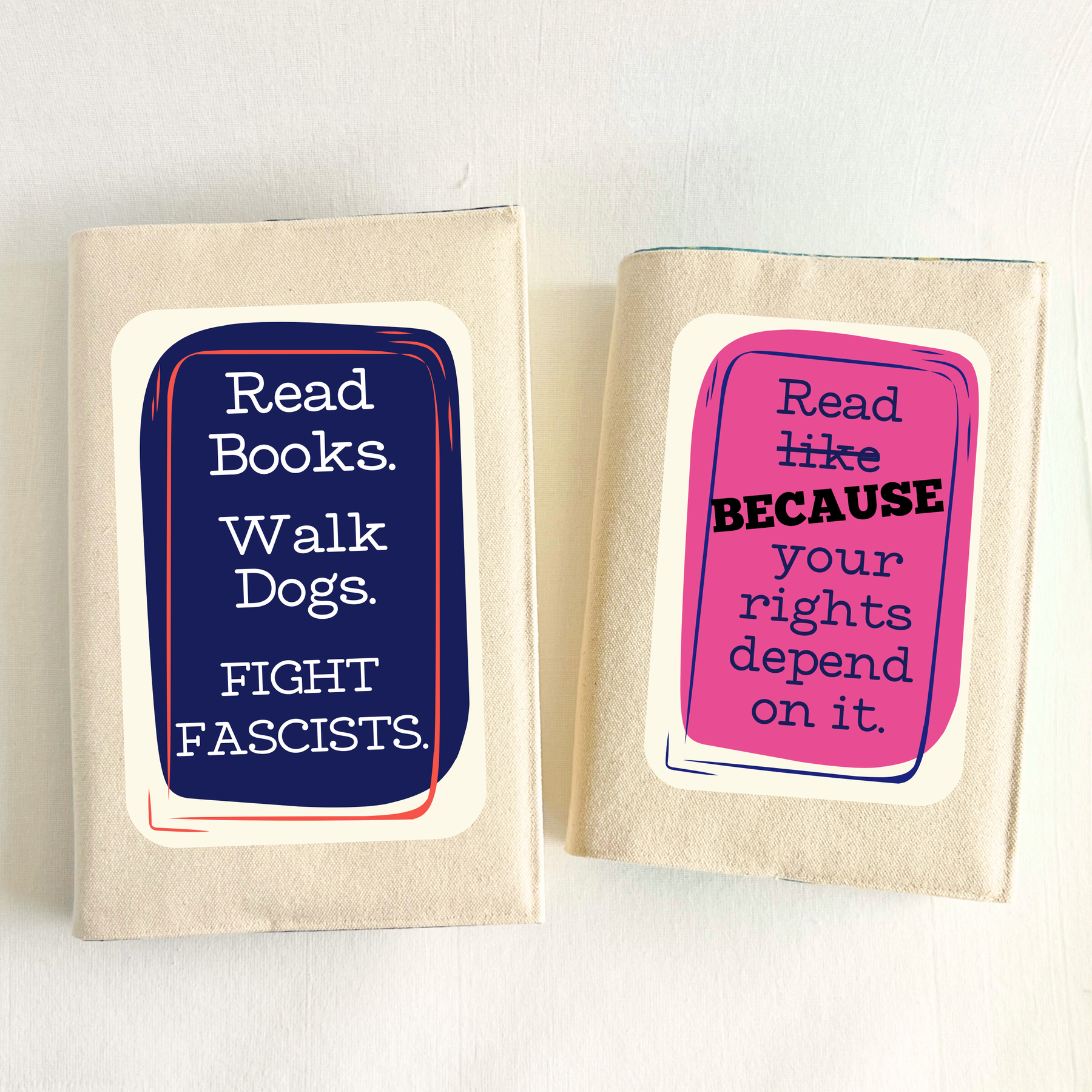 Canvas, reusable book covers in linen, with the words, 'Read Books. Walk Dogs. FIGHT FASCISTS.'  in white lettering placed on a rectangular navy box design on one cover, and 'Read like (because) your rights depend on it' in navy lettering on a pink box design.