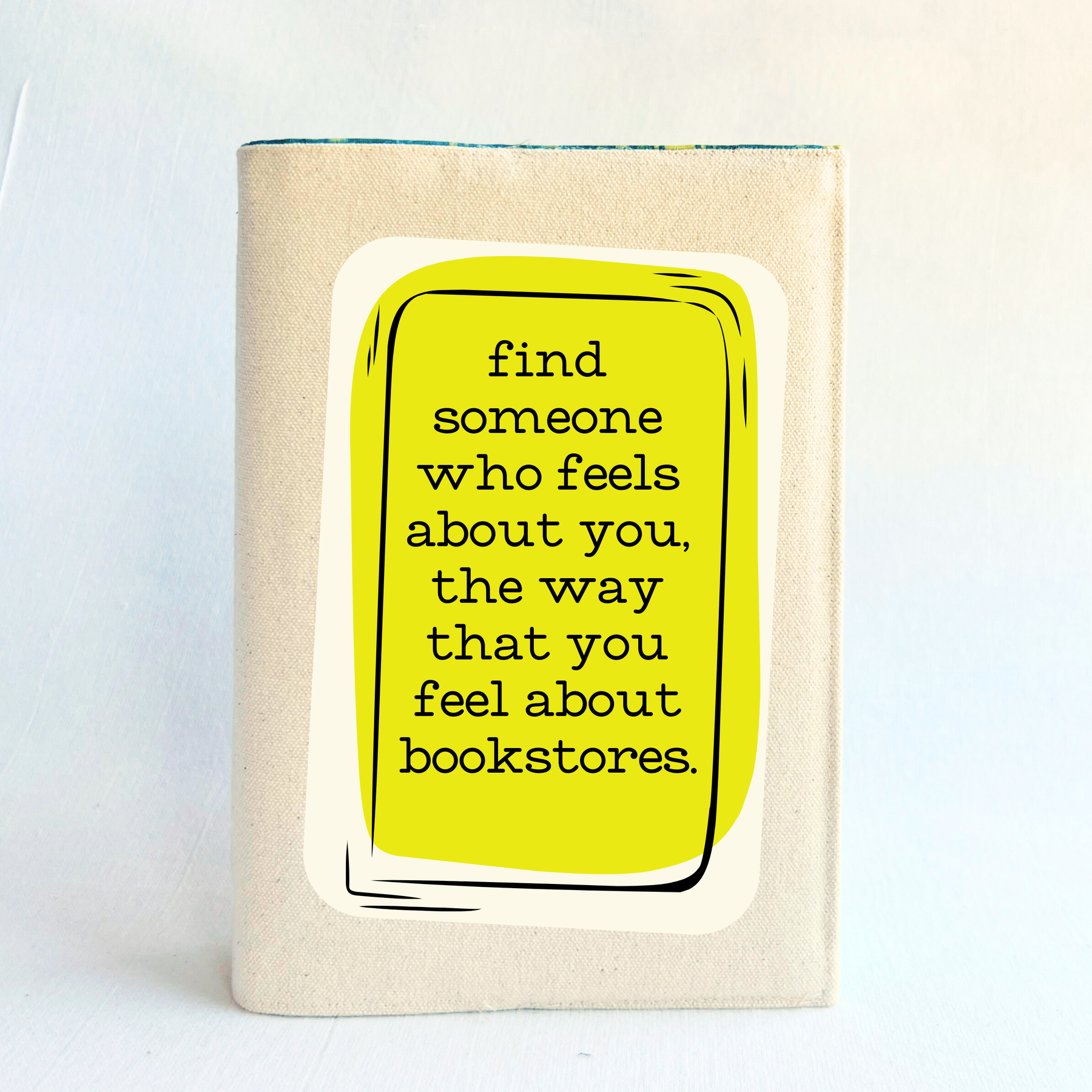 a book covered with a linen-color reusable, readjustable book cover.  A yellow square background has the words, 'find someone who feels about you, the way that you feel about bookstores' in black lettering.