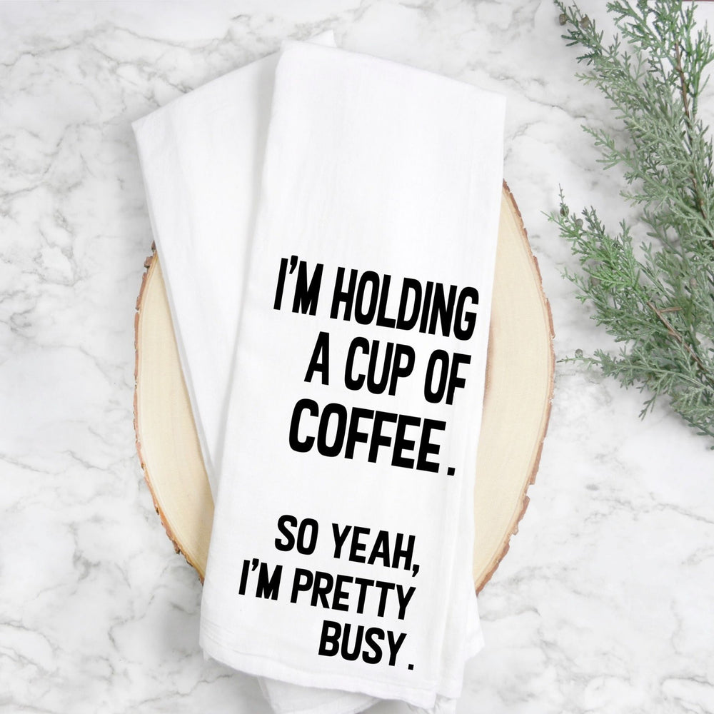 holding my coffee so yeah, i'm pretty busy - humorous kitchen bar towel LG